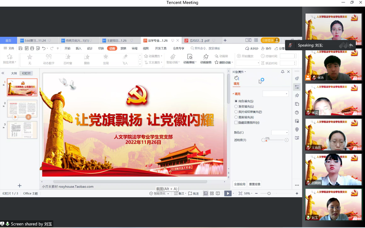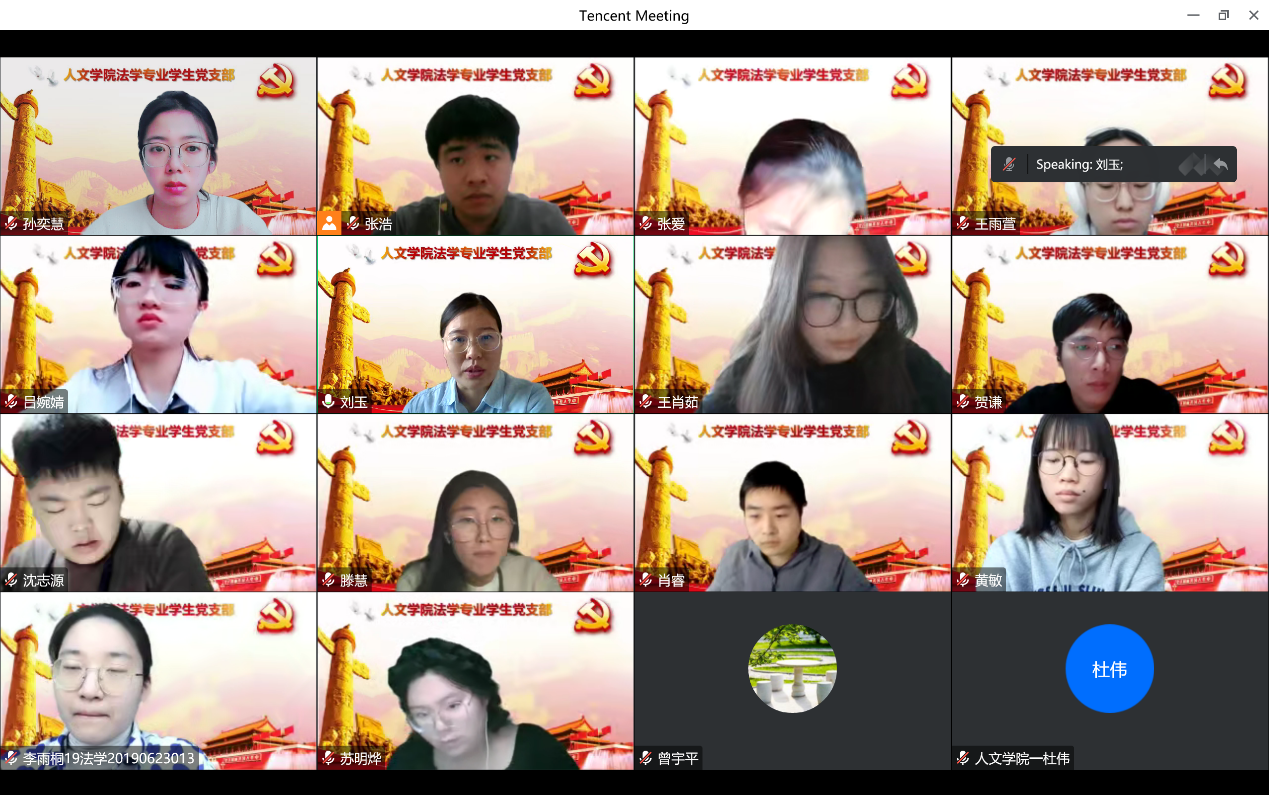 2022年11月26下午2点,beat365唯一官方网站法学专业学生党支部在通过腾讯会议的方式开展“让党旗飘扬,让党徽闪耀”主题党日活动。本次活动分为深入学习贯彻二十大精神、学习廉政建设和打赢疫情防控阻击战三方面的内容。活动由beat365唯一官方网站法学专业学生党支部书记刘玉老师主持,联系党支部的领导宣传部副部长曾宇平、beat365唯一官方网站党委书记杜伟、法学专业学生党支部全体党员及部分入党积极分子参与活动。