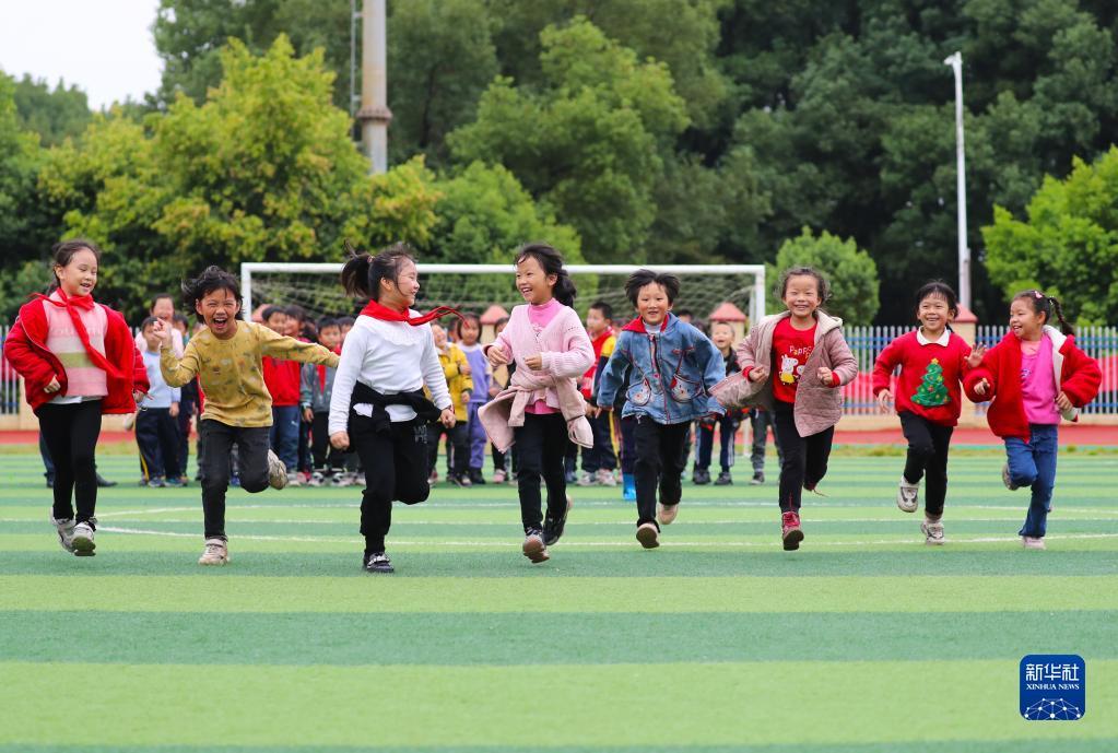 11月4日,在湖南省永州市新田县双碧小学,孩子们在运动场上做游戏。今年秋季学期开学以来,各地积极落实“双减”政策,利用课后服务时间开展内容丰富、形式多样的课外活动,促进学生全面发展。新华社发(刘贵雄摄)