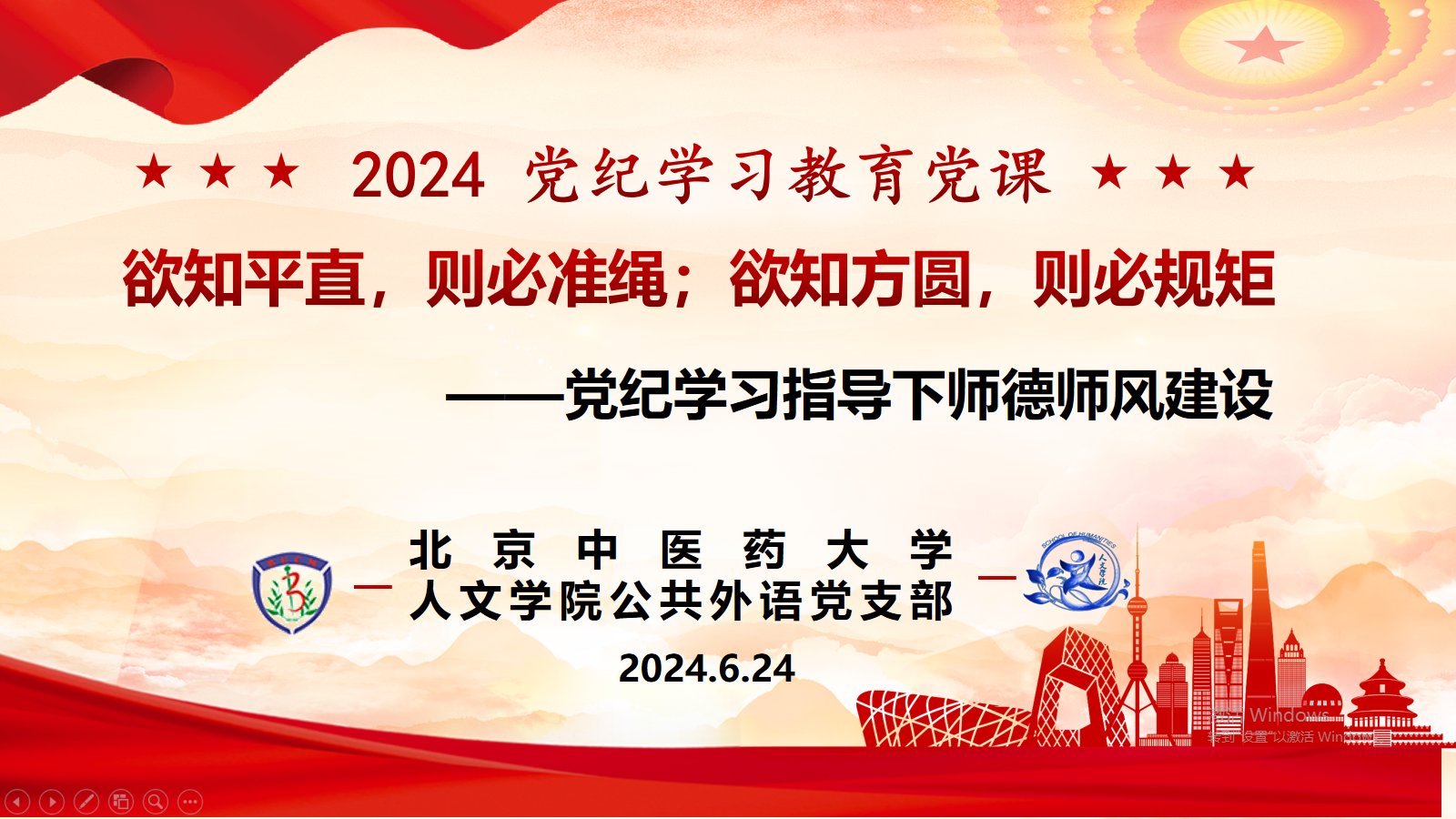 4月24日,陈子杰支部书记为beat365唯一官方网站公共外语党支部讲授党纪学习教育专题党课“党纪党课:欲知平直,则必准绳;欲知方圆,则必规矩——党纪学习下的师德师风建设”。学院党委委员陈锋院长、孔祥国副院长和研究生支部书记陈秋云老师出席了本次活动。