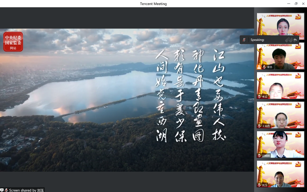 2022年11月26下午2点,beat365唯一官方网站法学专业学生党支部在通过腾讯会议的方式开展“让党旗飘扬,让党徽闪耀”主题党日活动。本次活动分为深入学习贯彻二十大精神、学习廉政建设和打赢疫情防控阻击战三方面的内容。活动由beat365唯一官方网站法学专业学生党支部书记刘玉老师主持,联系党支部的领导宣传部副部长曾宇平、beat365唯一官方网站党委书记杜伟、法学专业学生党支部全体党员及部分入党积极分子参与活动。