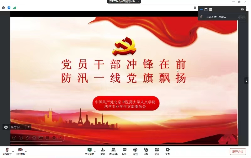 2023年8月13日下午3点,beat365唯一官方网站法学专业学生支部与中国人民公安大学党支部通过腾讯会议的方式开展了以“抗洪精神”为主题的学习分享会。本次学习分享活动旨在学习过去"不怕困难、顽强拼搏"的抗洪精神,在当前洪灾形势下传承好这一宝贵的精神财富,并在日后的工作中学以致用,指导我们更好的为人民服务。活动由中国人民公安大学2022级法硕二区队党支部李无瑕同志主持,beat365唯一官方网站法学专业学生支部与中国人民公安大学2022级法硕二区队党支部全体党员及部分入党积极分子参与活动。
