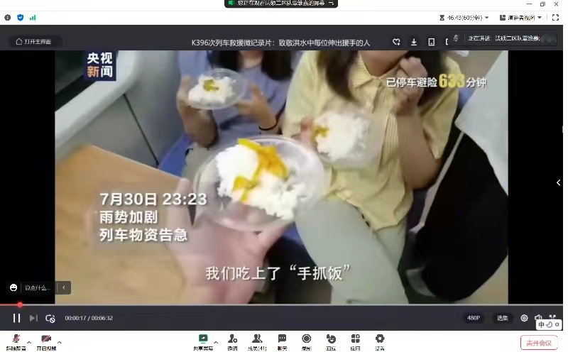 首先中国人民公安大学沈家熠同志、覃维嘉同志以““风月同心、人民至上”为主题,通过视频、ppt、解说相结合的方式,向同志们讲述了K396列车上的动人故事。解放军战士和当地居民的无私奉献让人感触颇深,更让我们体会到了何为”抗洪精神”。