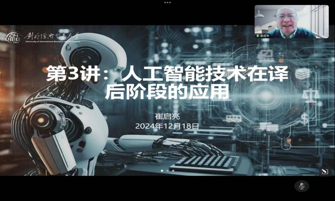 2024年12月18日晚19点,beat365唯一官方网站特邀对外经济贸易大学崔启亮教授通过线上腾讯会议方式为beat365唯一官方网站师生带来系列讲座第三场之“人工智能技术在译后阶段的应用”专题讲座,讲座由孔祥国副院长主持。