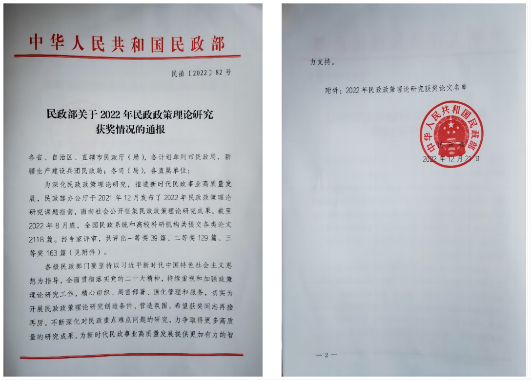 为深化民政政策理论研究,推进新时代民政事业高质量发展,民政部办公厅于2021年12月发布了2022年民政政策理论研究课题指南,面向社会公开征集民政政策理论研究成果。截至2022年8月底,全国民政系统和高校科研机构共提交各类论文2118篇。经专家评审,共评出一等奖39篇、二等奖129篇、三等奖163篇。这些理论成果为更好地解决民政事业中存在的重点难点问题提供了宝贵的理论支撑,指导民政事业更科学更高效地为人民服务。