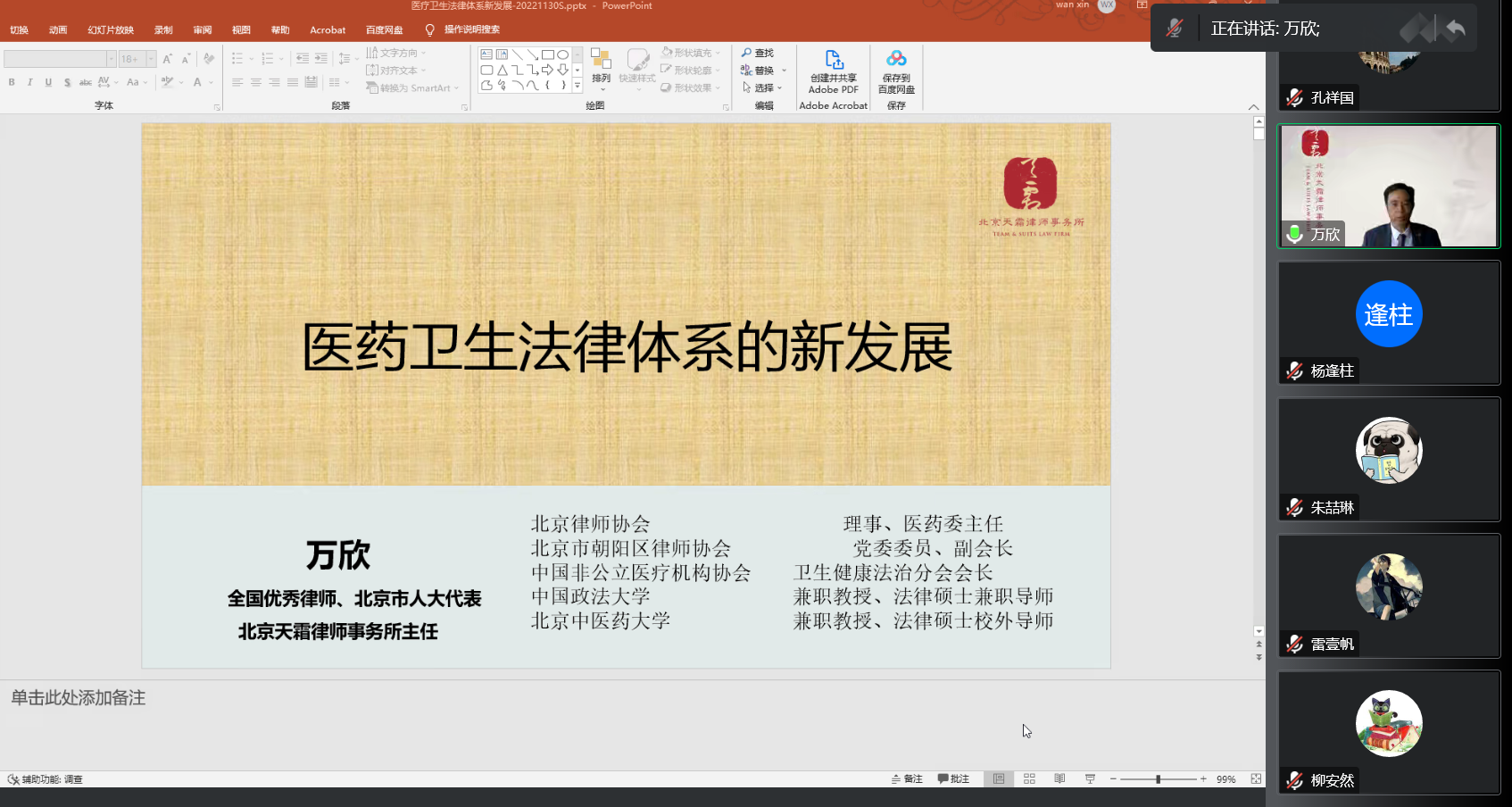 2022年11月30日下午,beat365唯一官方网站邀请全国优秀律师万欣进行“医药卫生体系新发展”主题讲座。讲座以线上腾讯会议形式进行,由法律系主任杨逢柱主持,孔祥国副院长致辞,beat365唯一官方网站师生50余人在线聆听讲座并积极参与互动讨论和交流。
