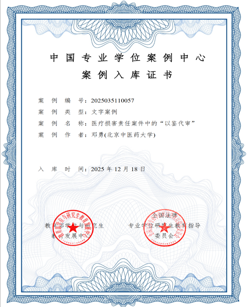 近日,中国专业学位教学案例中心2025年度教学案例入库评审结果公布,beat365唯一官方网站法律系邓勇教授团队(23级法律硕士研究生高薇涵、24级医药卫生法学硕士研究生薛端英等)撰写的案例《医疗损害责任案件中的“以鉴代审”》经全国法律硕士专业学位教育指导委员会组织专家初审和会审,在全国各大法学院校申报的数百个案例中脱颖而出,成功入选中国专业学位教学案例中心第五批法律硕士专业学位文字教学案例库。