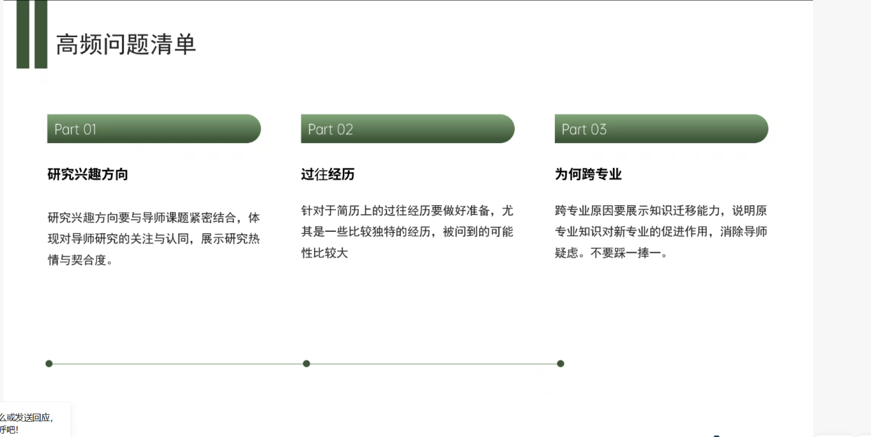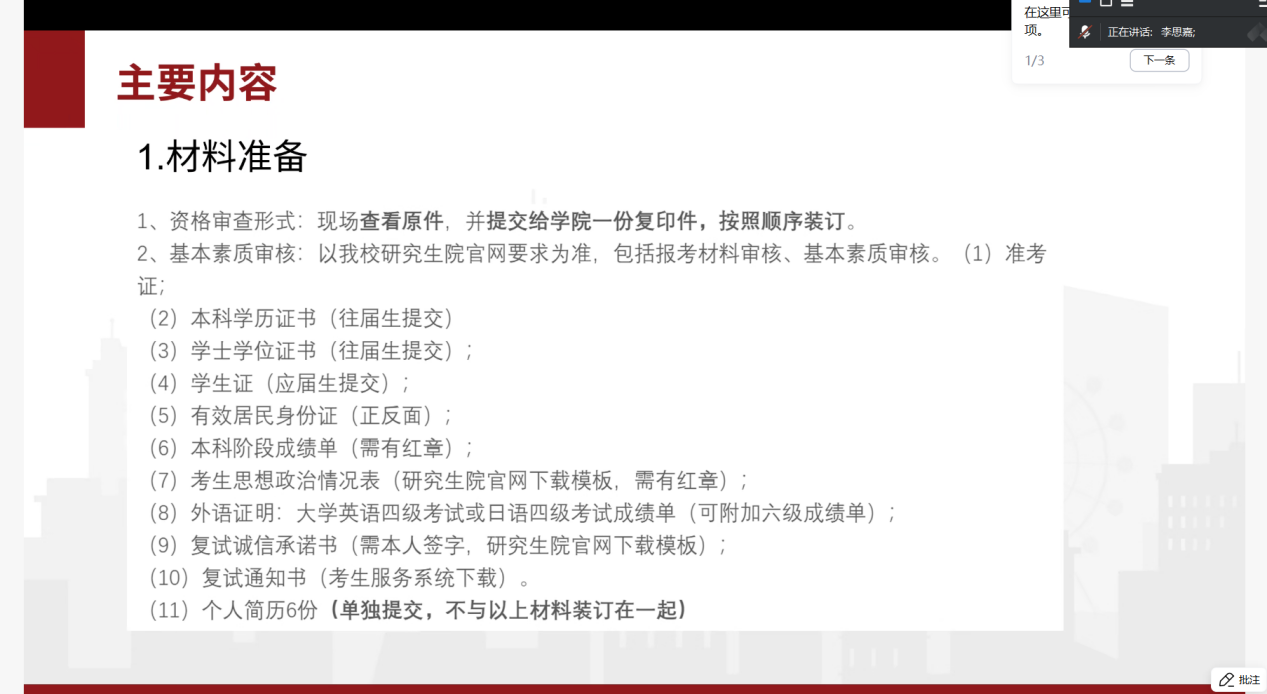李思嘉,中医药外语专业,主要围绕“复试材料准备”与“面试要点”展开分享。在复试材料准备方面,她强调简历需突出科研经历、毕业论文核心成果,量化成果并简洁排版;面试技巧方面,她指出回答问题需礼貌、逻辑清晰,运用结构化表达;在导师提问环节中可能涉及简历中的毕业设计,建议同学们提前梳理研究思路。