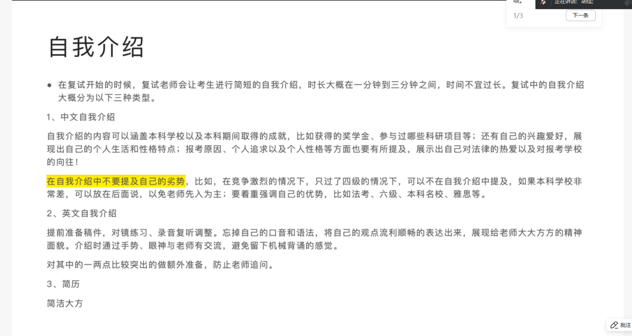 之后,胡佳,法律法学专业,系统解析了法律专业复试流程。他强调要在自我介绍上要突出学术背景与职业规划,同时时间控制在2分钟内。英语测试中要将日常对话与专业术语的掌握并重,多练习模拟问答训练;在专业面试时要结合法律条文与热点案例,展现逻辑思辨能力;在做答时注重层次分明,体现个人法律素养。