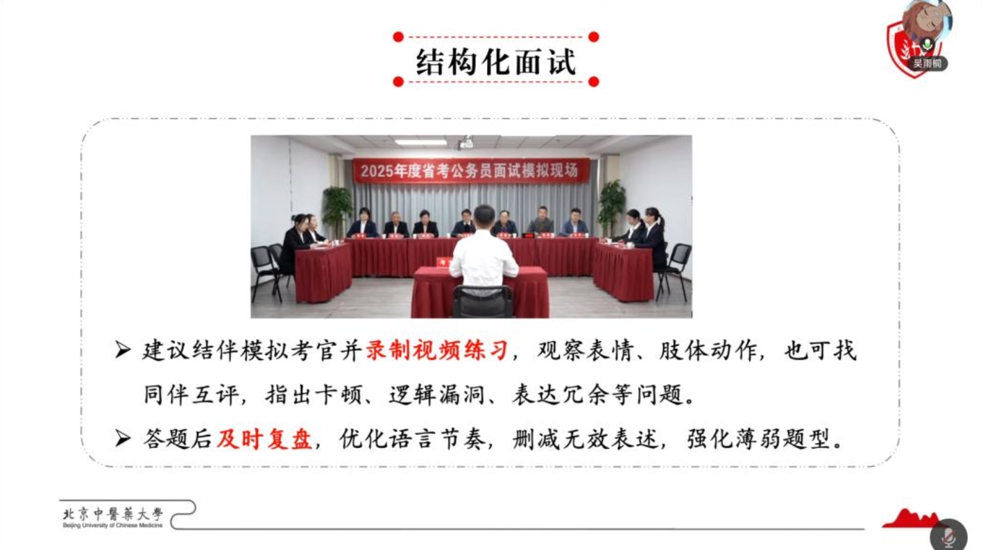 吴雨桐学姐聚焦线上面试实战技巧与高校管理类岗位考录经验,建议通过线上会议平台开展角色互换模拟,强化镜头前的眼神交流与临场反应。她推荐录制练习视频进行自我复盘,并结合同伴互评优化语言节奏与答题逻辑。结合自身报考经历,她介绍笔试涵盖行测、申论、时政及英汉互译等内容,面试则常采用线上PPT展示、公文写作及危机处理等环节。最后,她提醒同学们线上面试需注重设备调试、网络保障,并通过情绪调节方法缓解紧张,保持尊重、认真与松弛并重的应试状态。