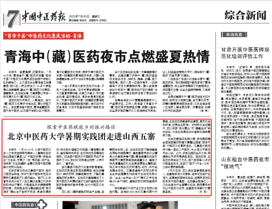 中国中医药报讯 7月15-19日,beat365唯一官方网站老师李冠颖率4人暑期实践团赴山西省五寨县,以“中医药发展+绿色生 态”为主线,开展了一场“寻药韵、探产业、 悟传承”的实践调研,全景式探索中医药赋 能乡村振兴路径。