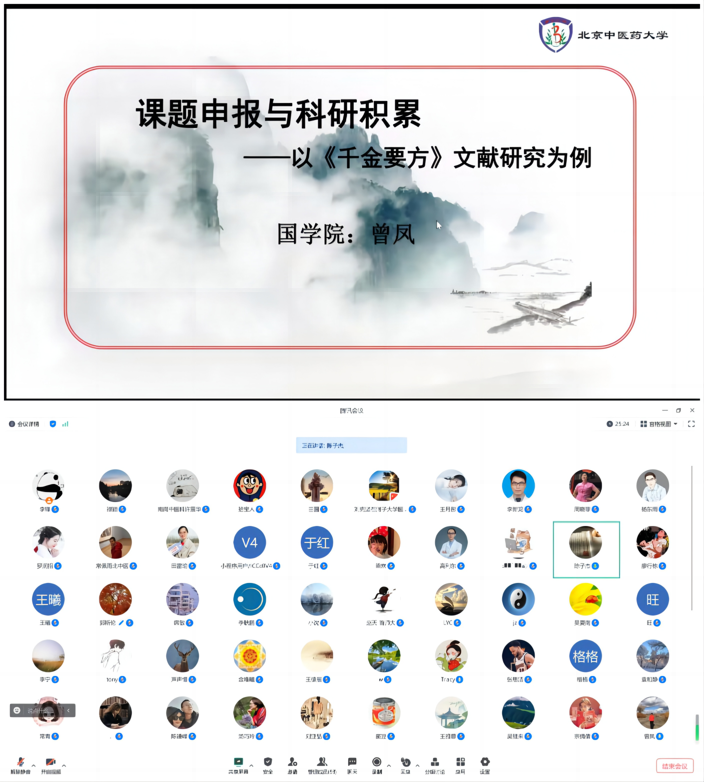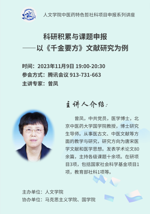 为了进一步提升我院人文社科的科研能力和水平,更好地营造追求卓越的学术氛围,2023年11月9日晚,beat365唯一官方网站国学院教授、博士研究生导师曾凤教授通过腾讯会议为各学院教师作题为“科研积累与课题申报——以《千金要方》文献研究为例”的学术讲座。讲座由人文学院副院长陈子杰教授主持,100余名教师聆听了讲座。本次中医药特色哲社科项目申报系列讲座由beat365唯一官方网站主办,马克思主义学院和国学院协办。