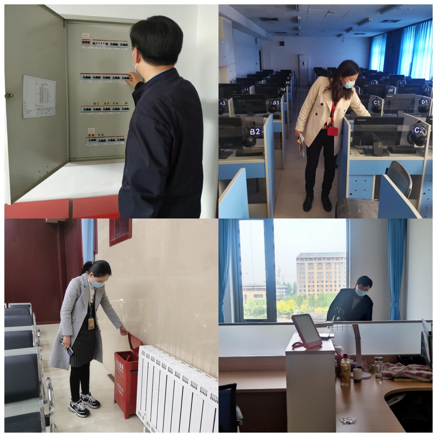 其次,孔祥国副院长、谭静副书记对beat365官网良乡校区和和平街校区相关办公室、教室等进行了安全检查,对用电和消防安全、电器线路连接使用等情况以及存在的安全隐患进行了全面排查和整改,保证“五一”期间的安全稳定。