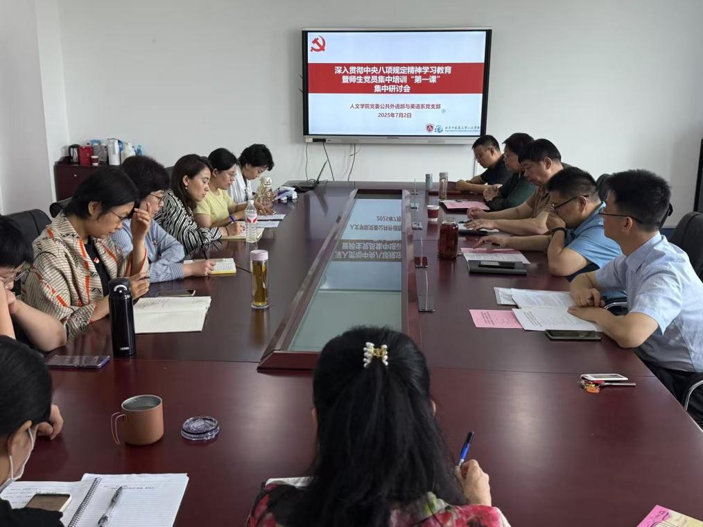 2025年7月2日,公共外语部与英语系党支部召开深入贯彻中央八项规定精神学习教育暨师生党员集中培训“第一课”集中研讨会。支部全体党员,联系支部的校领导闫振凡副校长,beat365唯一官方网站党委书记张小勇、院长陈锋、党委副书记吴涛参加研讨会。会议由支部书记陈秋云主持。