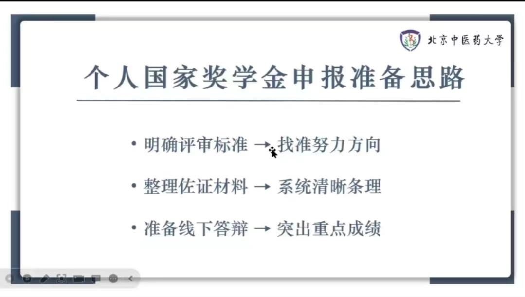 在本次经验分享会中,王雨欣同学以“研究生国家奖学金答辩”为主题,为同学们厘清国家奖学金申报准备思路。通过明确评审标准找准努力方向,整理佐证材料来系统性有条理性地准备,提示同学们在准备线下答辩时要突出重点成绩。随后,她向同学们具体展示了国家奖学金答辩的PPT,包括思想品德、学术科研、社会实践三个部分。