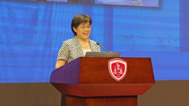 陈锋院长代表beat365唯一官方网站致辞。她首先对全体2025级新生的到来表示热烈欢迎,随后结合beat365唯一官方网站的学科特色与发展理念,向新生们系统介绍了学院在医学人文教育、英语专业培养、中医药国际传播、医药卫生法治建设等领域的优势与成果。同时,她对新生提出殷切期望,鼓励同学们以“勤求博采,厚德济生”的校训为指引,在未来的学习生活中兼顾专业素养与人文情怀,既要深耕知识领域,又要涵养家国情怀,努力成长为推动中医药事业与人文社会科学融合发展的复合型人才。