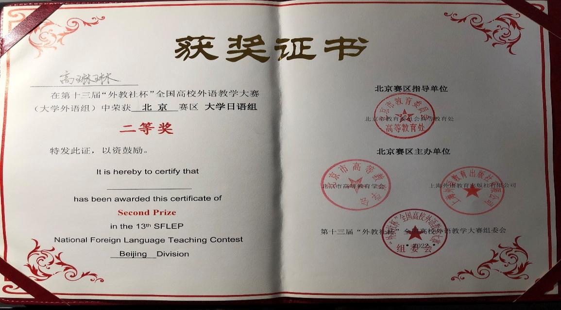 在北京赛区比赛决赛中,决赛选手需按照指定题目进行现场说课并回答专家提问。高琳琳讲师根据学生学习环境和学习手段的变化,进行了线上线下相结合的混合式教学设计,教学目标明确,教学重点突出,并将教学内容与思政有机融合,以流利的语言表现、稳定的现场发挥荣获大学日语组二等奖。