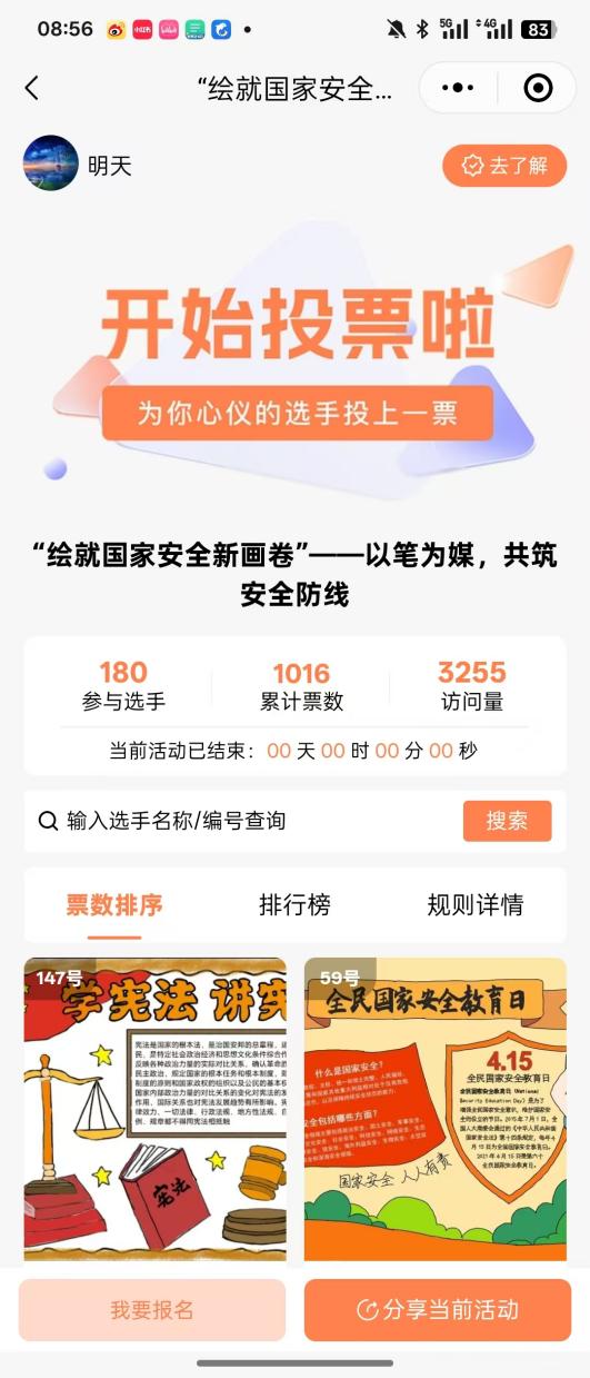 活动筹备阶段,法咨中心学术部精心策划活动方案,业务部高效完成宣传推送与物资采购,外联部联动多方资源保障活动落地。4月15日至22日,通过线上小程序征集作品,学生们踊跃投稿,一幅幅构思精巧的手抄报、色彩斑斓的绘画作品,将抽象的国家安全理念转化为具象的艺术表达。4月22日至25日,线上投票通道开启,师生们积极为心仪作品助力,以艺术张力传递守护国家安全的坚定信念。