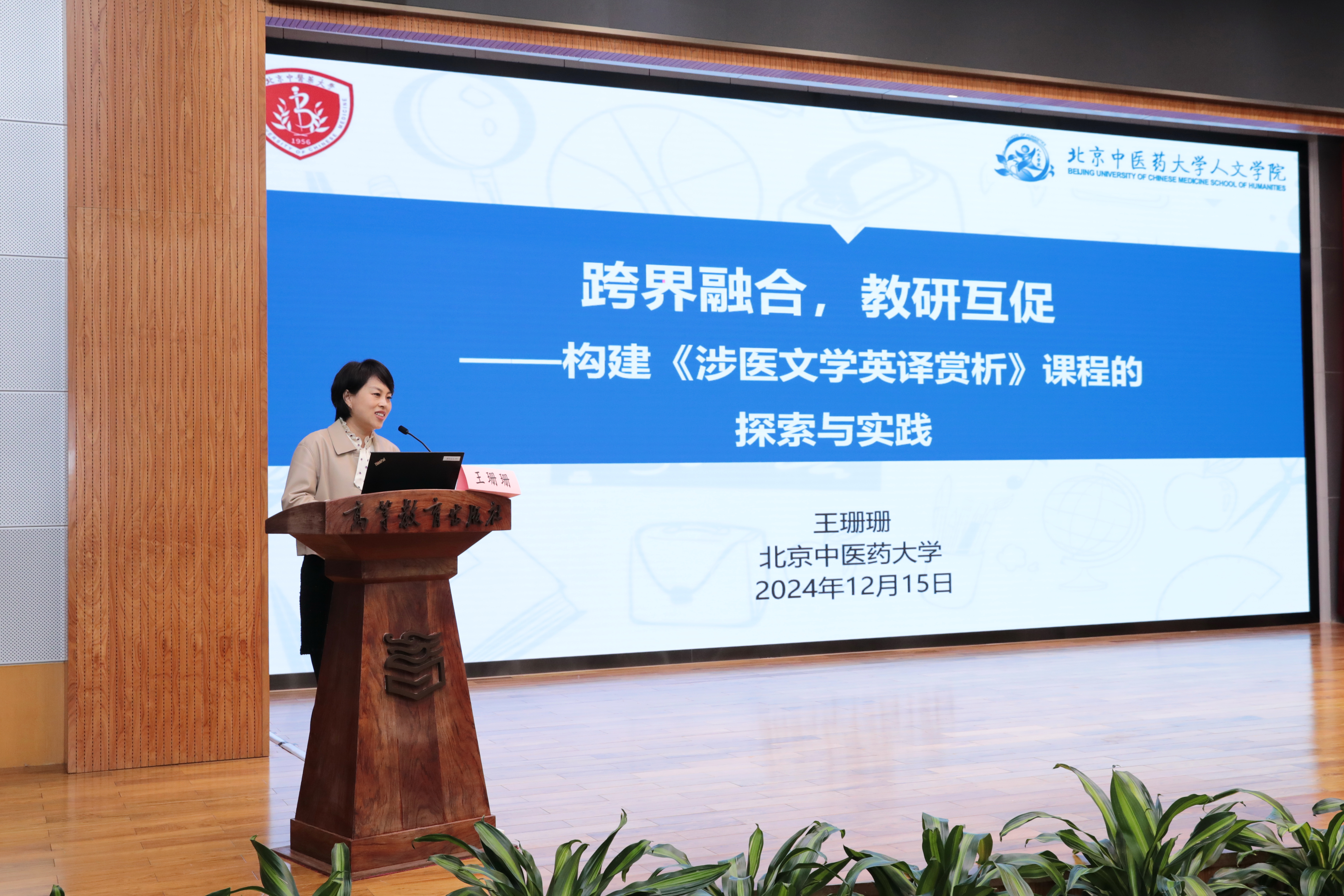 2024年12月15日,在北京市高教学会大学英语研究分会第21届理事全会上,beat365唯一官方网站王珊珊副教授主讲的《涉医文学英译赏析》课程荣获“大英好课奖”,同时王珊珊副教授作为获奖代表,应邀发表了题为《跨界融合,教研互促——构建<涉医文学英译赏析>课程的探索与实践》的主旨报告,分享了自2017年以来构建该课程的心路历程。