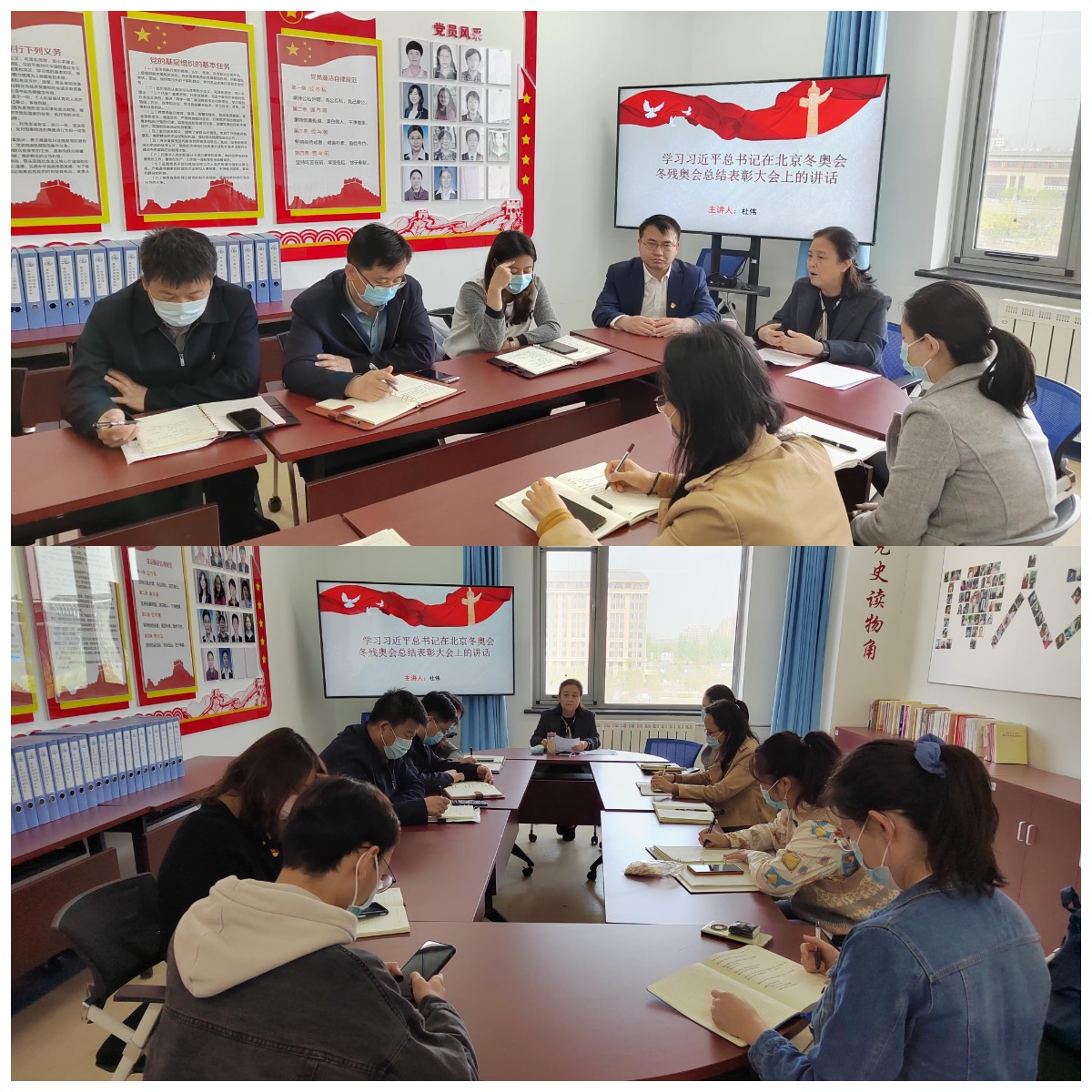 4月12日在良乡校区beat365唯一官方网站党员之家,beat365唯一官方网站党委理论学习中心组联合行政综合党支部召开专题学习会,学习习近平总书记在北京冬奥会、冬残奥会总结表彰大会上的讲话精神。学院党委委员、行政综合党支部党员参加了此次会议,同时还邀请冬奥会、冬残奥会志愿者王艺真、王艺超两位同学分享了他们的冬奥经历。学院党委副书记谭静主持学习会。
