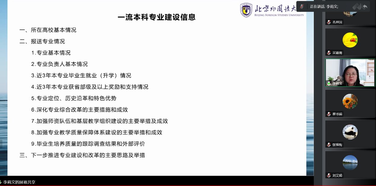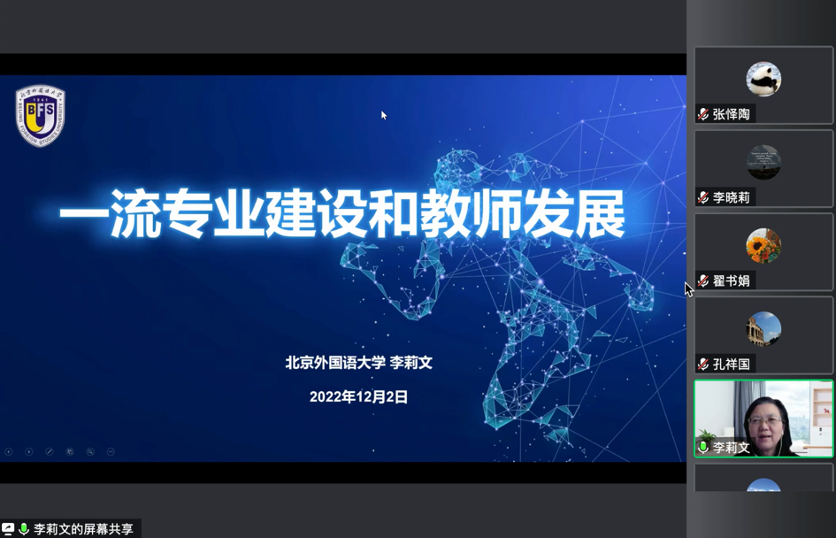 2022年12月2日上午,beat365唯一官方网站特邀北京市教学名师、北京外国语大学教务处处长、教育部高等学校外国语言文学类专业教学指导委员会秘书长、中国高校外语慕课联盟秘书长李莉文教授为beat365唯一官方网站教师带来题为“一流专业建设和教师发展”的专题培训讲座。讲座由孔祥国副院长主持,英语系及公共外语部教师在线聆听讲座并积极参与讨论。