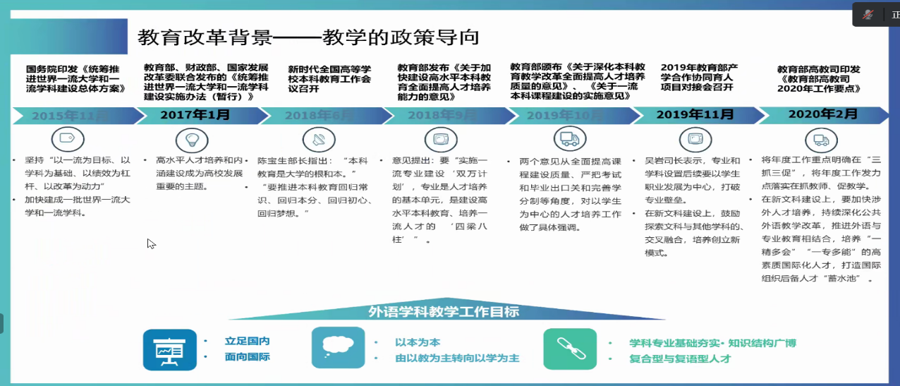 其次,李教授向参会教师强调了考察一流专业建设工作的主要关注点。她指出,一流专业建设应紧跟教育部的最新建设与发展指导意见,重点思考如何深化专业综合改革、加强师资队伍和基层教学组织建设、强化专业教学质量保障体系建设。最后,李教授建议以课程建设促进教师职业发展并解读了课程建设的要点。她指出,教师发展应以课程建设为抓手,建设一流课程应严谨设定课程目标,注意问题导向,重点打磨教学理念、教学策略、教学方法、课程设计、教学日历。