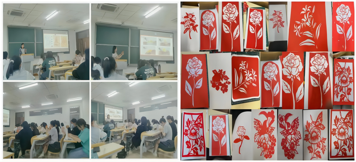 授课过程中,陈天琪老师讲授了中国剪纸的历史和派系,带领大家欣赏了全国各地派系的剪纸作品,并讲授中国剪纸的用途,包括但不限于窗花、喜花、礼花等剪纸,与此同时,老师还介绍了中国剪纸的分类以及立体剪纸、阴阳刻等重要的剪纸技法。课堂上,同学们细心聆听,时不时向老师提出关于剪纸的各种问题,老师也耐心地解答同学们的疑问。实践过程中,大家通过折叠纸材、工具雕刻等方式,都制作出了令自己满意的作品。
