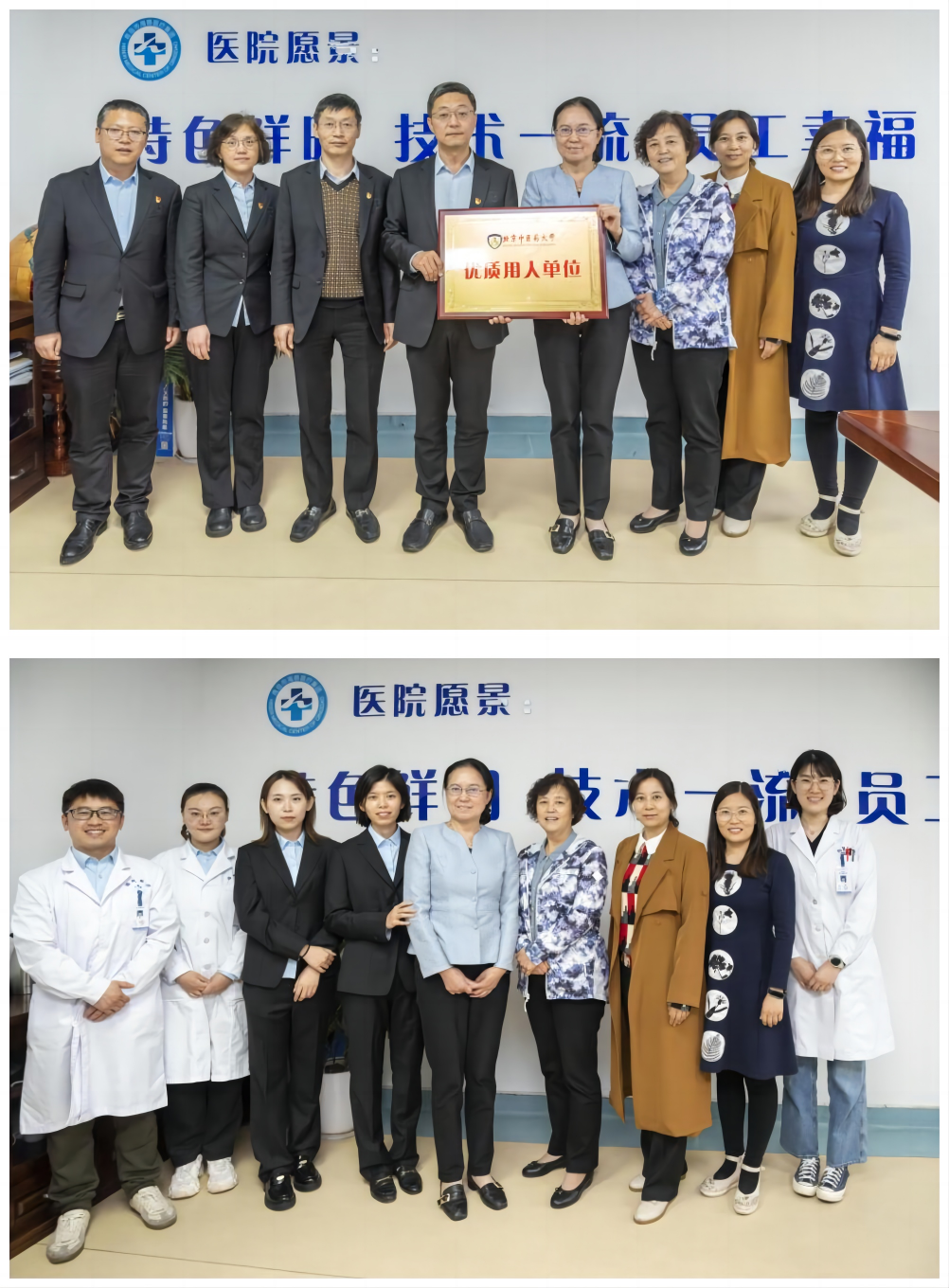 5日下午,田润平处长一行人到青岛市海慈医院走访,走访医院的同时看望了在医院工作的北中医毕业生。在座谈会中,海慈中医医疗集团党委书记、总院长池一凡介绍了集团的基本情况以及未来规划,对北中医的优质学生资源表示欢迎。田润平处长对海慈医院的支持表达了感谢,并介绍了我校学生的管理与培养体系,双方就临床教学、人才培养、科研创新等方面进行了交流,旨在强化与优秀临床医院衔接、不断深化交流合作。而后,集团5位北中医的硕博毕业生作为毕业生代表,畅谈了对母校的感恩以及就业后在海慈工作的感受,并表示希望更多优秀的校友能够加入海慈。最后,双方进行了授牌仪式,为进一步加深校企合作、畅通毕业生就业渠道达成了共识。