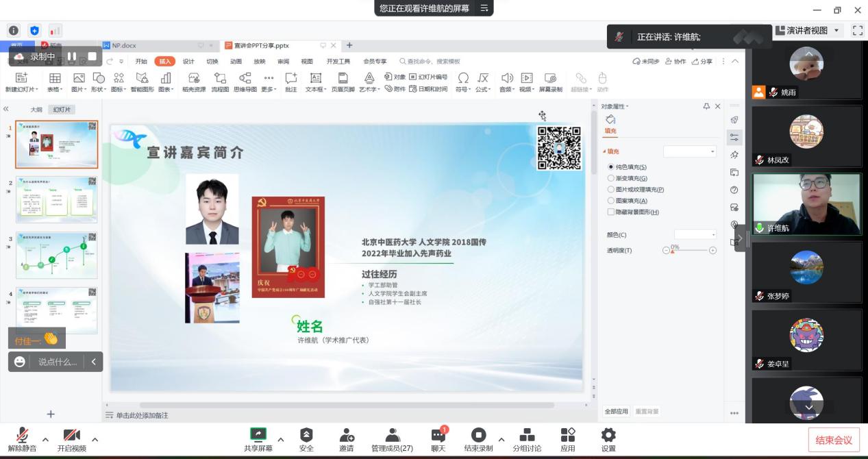 为了帮助毕业生更好地了解当前就业形势的发展变化,把握就业的机遇与挑战,beat365唯一官方网站开展了就业月宣传活动。2022年11月2日下午19点,beat365唯一官方网站举办了就业启航系列-企业专场经验分享会,帮助同学们了解求职就业相关方面的内容。本次活动学院邀请了两位优秀校友,分别是就职于江苏先声药业有限公司(北京分公司)的2022届毕业生许维航和目前在ICON作为CTA外派到强生的2021届毕业生林凤改。